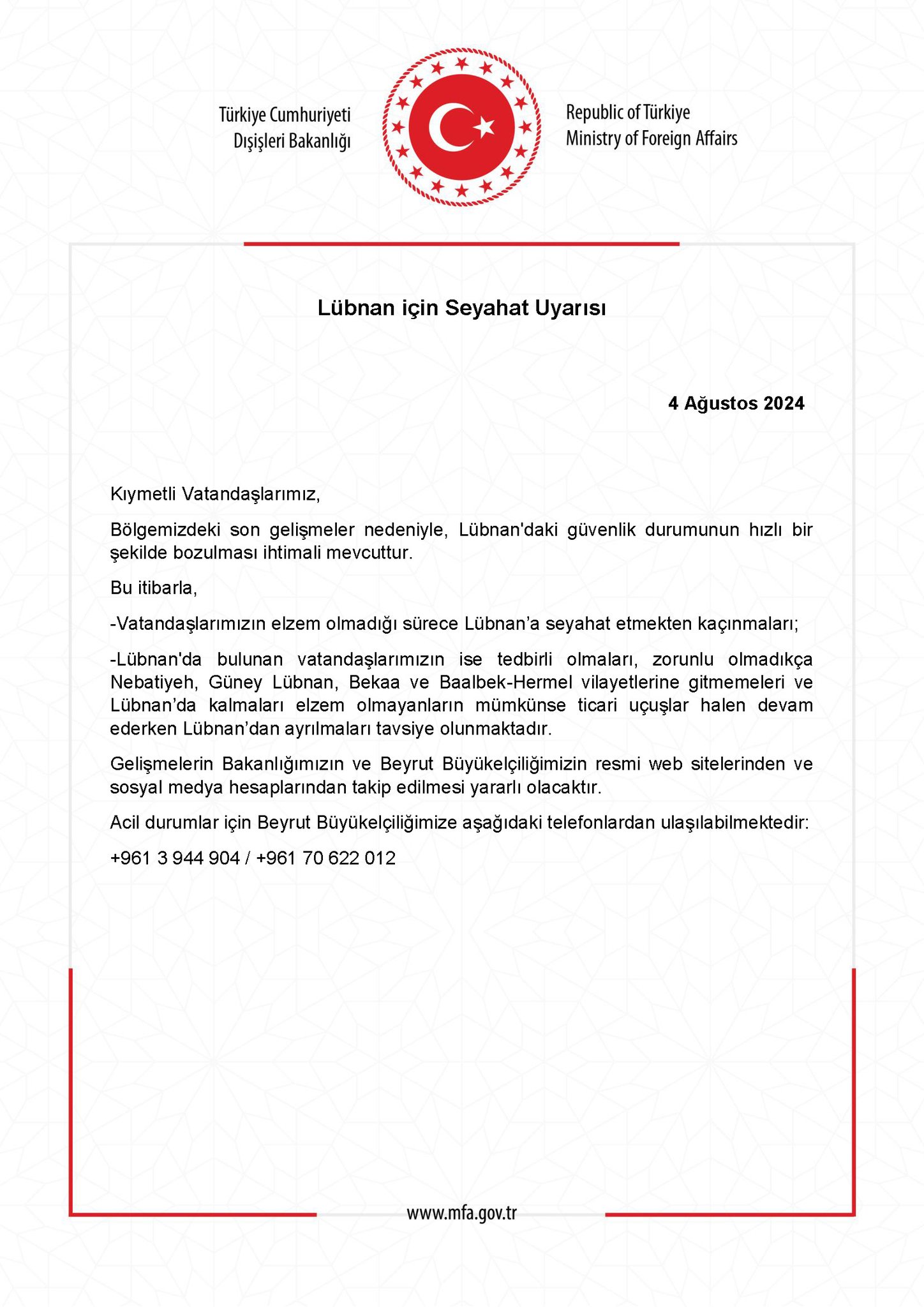 Ana Sayfa › Dünyadan › Dışişleri Bakanlığı’ndan Lübnan için seyahat uyarısıDışişleri Bakanlığı’ndan Lübnan için seyahat uyarısıDışişleri Bakanlığı’ndan Lübnan için seyahat uyarısı geldi. Gökhan Artan TÜM YAZILARI Giriş: 04-08-2024 22:59Güncelleme: 04-08-2024 23:00 Dünyadan Dışişleri Bakanlığı’ndan Lübnan için seyahat uyarısı geldi