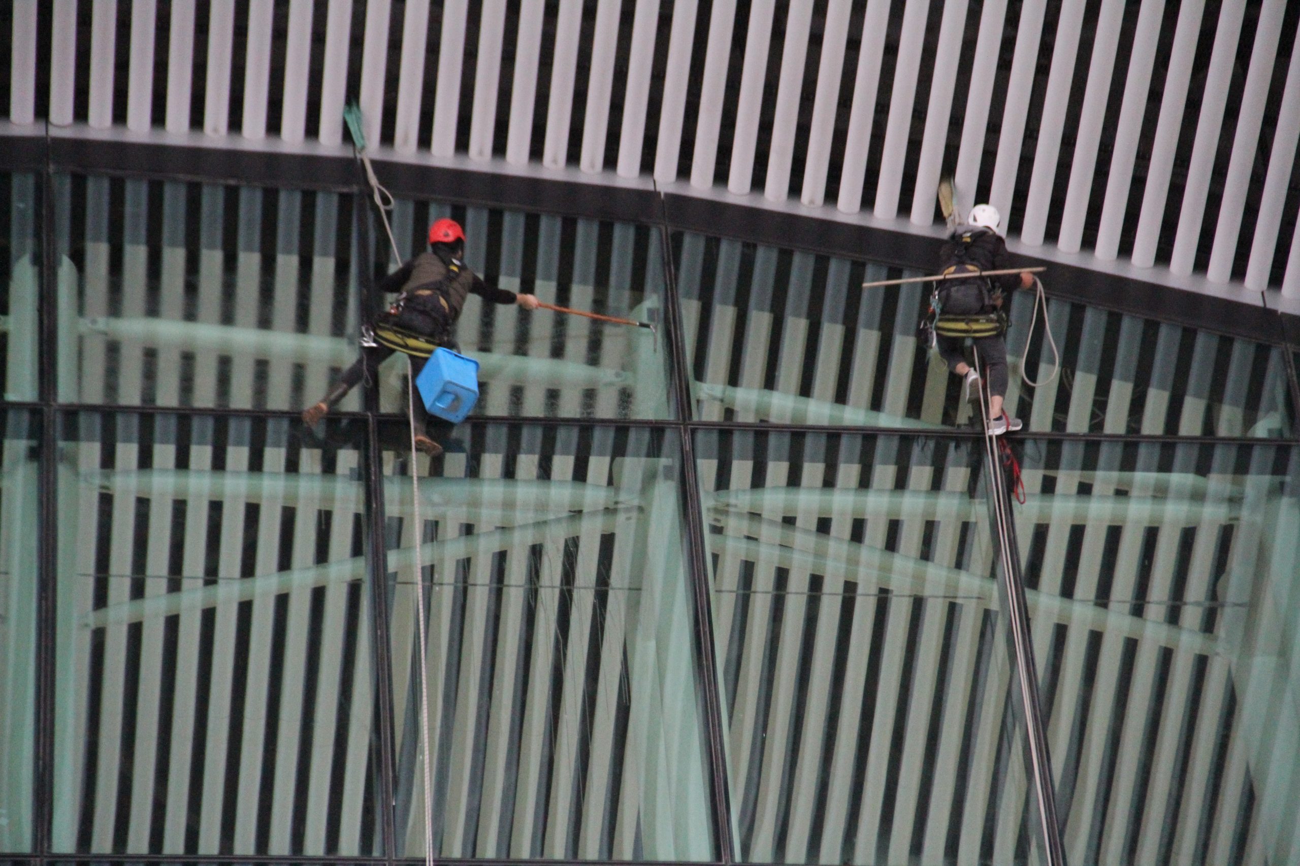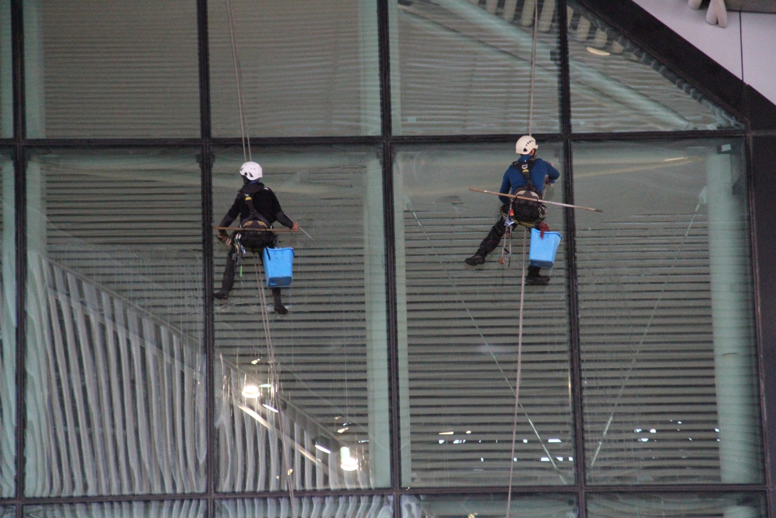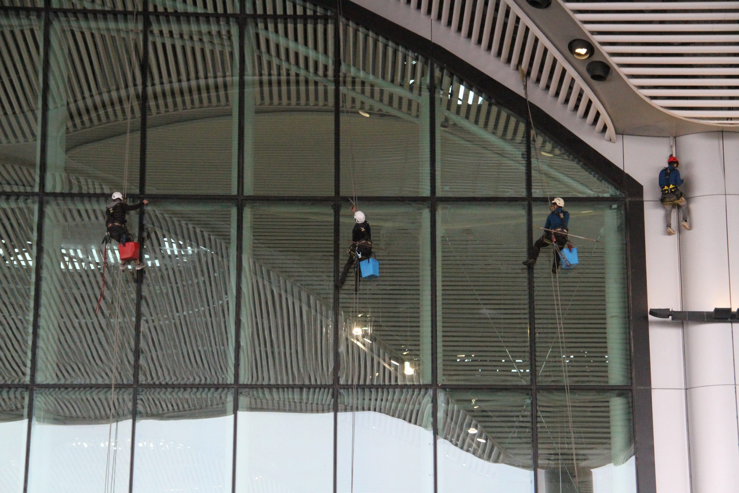 Yaklaşık 32 metre yükseklikteki camlara tırmanan profesyonel dağcıların temizliğini de yolcular dikkatle izliyor. Camları silen personeller güvenlik önlemlerini ön planda tutarken, terminalin çatısından sabitlenen halatlar üzerinde hareket eden görevliler, kafalarındaki kasklarıyla çalıştı.