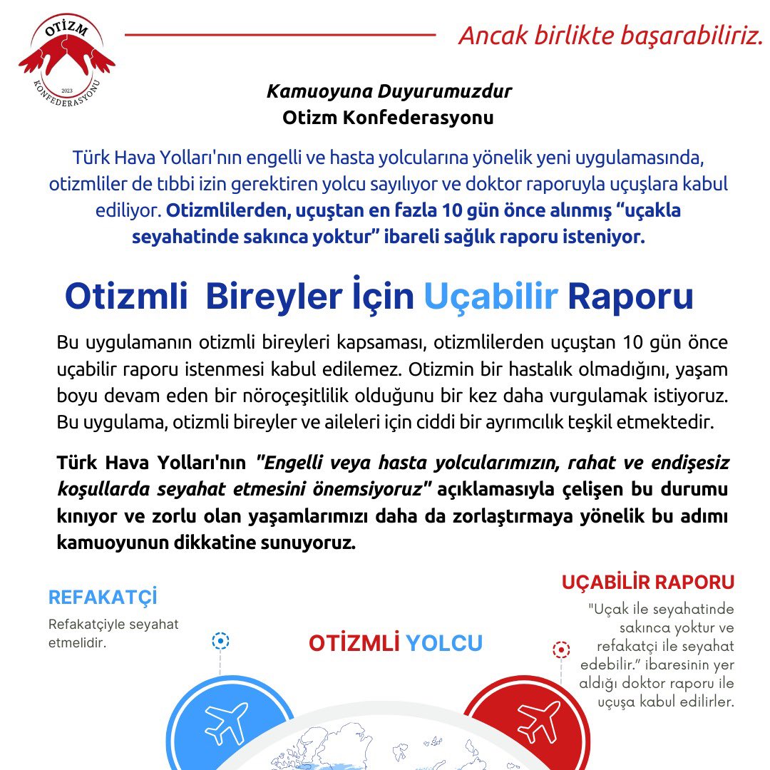 “Türk Hava Yolları’nın engelli ve hasta yolcularına yönelik yeni uygulamasında, otizmliler de tıbbi izin gerektiren yolcu sayılıyor ve doktor raporuyla uçuşlara kabul ediliyor. Otizmlilerden, uçuştan en fazla 10 gün önce alınmış “uçakla seyahatinde sakınca yoktur” ibareli sağlık raporu isteniyor. Bu uygulamanın otizmli bireyleri kapsaması, otizmlilerden uçuştan 10 gün önce uçabilir raporu istenmesi kabul edilemez. Otizmin bir hastalık olmadığını, yaşam boyu devam eden bir nöroçeşitlilik olduğunu bir kez daha vurgulamak istiyoruz. Bu uygulama, otizmli bireyler ve aileleri için ciddi bir ayrımcılık teşkil etmektedir. Türk Hava Yolları’nın “Engelli veya hasta yolcularımızın, rahat ve endişesiz koşullarda seyahat etmesini önemsiyoruz” açıklamasıyla çelişen bu durumu kınıyor ve zorlu olan yaşamlarımızı daha da zorlaştirmaya yönelik bu adımı kamuoyunun dikkatine sunuyoruz”