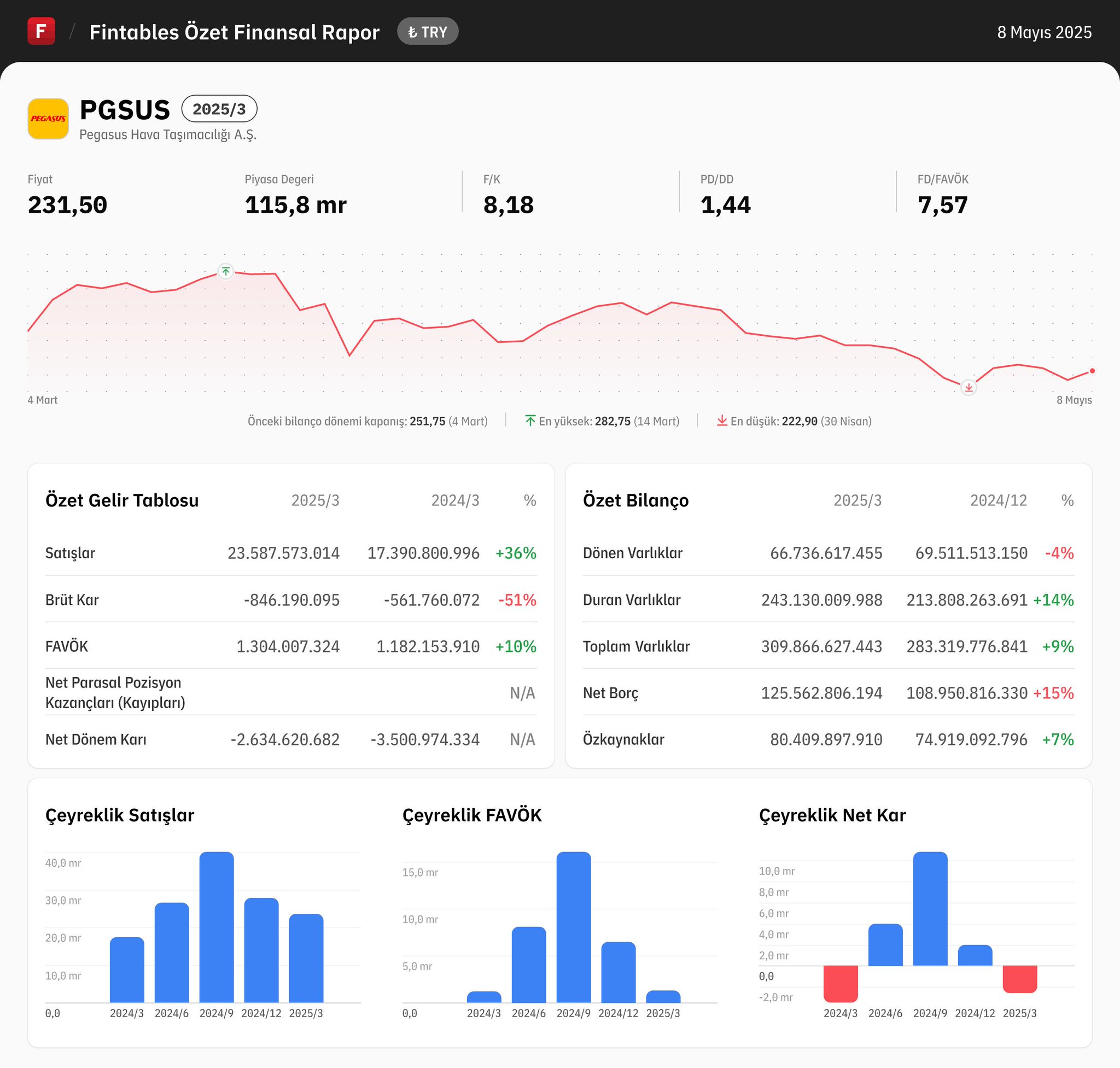 Pegasus’un, 2025 yılı ilk çeyrek sonuçlarına göre şirket, 2,6 milyar TL zarar açıkladı.Satış gelirleri çeyreksel bazda yüzde 15 azalış gösterdi. Şirket ilk çeyrekte -846,2 milyon TL brüt zarar yazdı.
