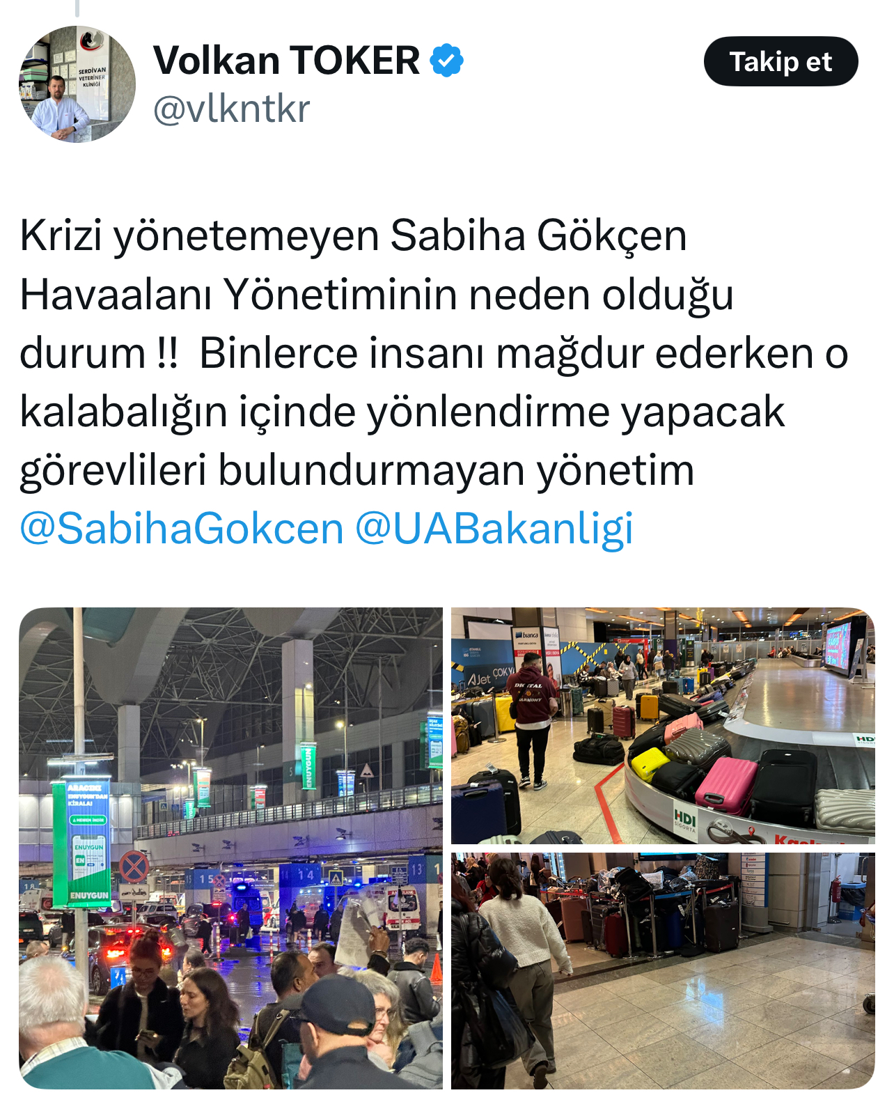 Sosyal medya hesabından havalimanını eleştiren Sakarya Veteriner Hekimler Odası Başkanı Volkan Toker şu paylaşımı yaptı: “Krizi yönetemeyen Sabiha Gökçen Havaalanı Yönetiminin neden olduğu durum !! Binlerce insanı mağdur ederken o kalabalığın içinde yönlendirme yapacak görevlileri bulundurmayan yönetim… Sistem arızası olabilir normaldir ama bu krizi yönetememek operasyonun hatasıdır. İnsanları balık istifi 40 derece koridorlarda yığmak nedir ya…”