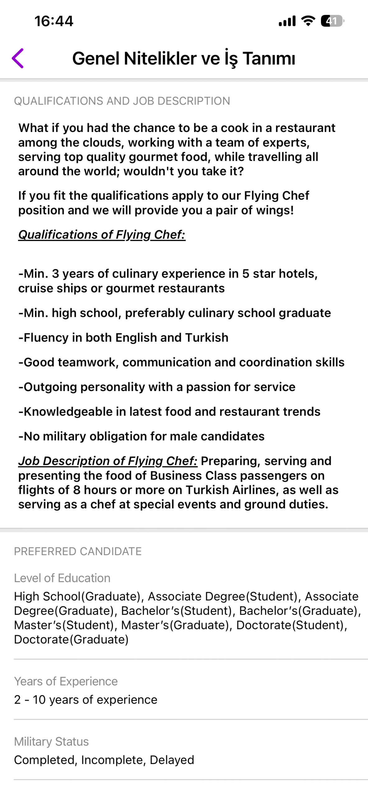 Uçan Aşçı İş Tanımı: Business Class yolcularına 8 saat ve üzeri uçuşlarda Türk Hava Yolları’nda yemek hazırlama, servis yapma ve sunma; aynı zamanda özel etkinlikler ve yer görevlerinde aşçılık yapma.
