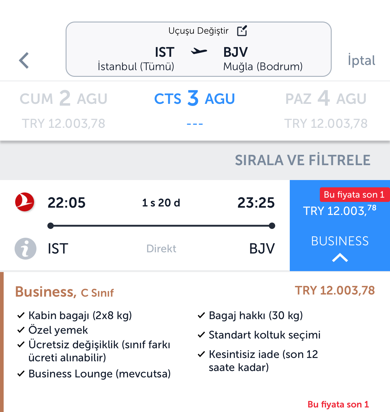 Ana Sayfa › Havacılık › THY’nin iç hatlarda en pahalı biletleriTHY’nin iç hatlarda en pahalı biletleriTürk Hava Yolları’nın iç hatlarda tek yön ve aktarmasız en pahalı biletleri business class’ta 12 bin liraya kadar çıktı. Gökhan Artan TÜM YAZILARI Giriş: 02-08-2024 09:27 Havacılık Türk Hava Yolları’nın iç hatlarda tek yön ve aktarmasız en pahalı biletleri business class’ta 12 bin liraya kadar çıktı.