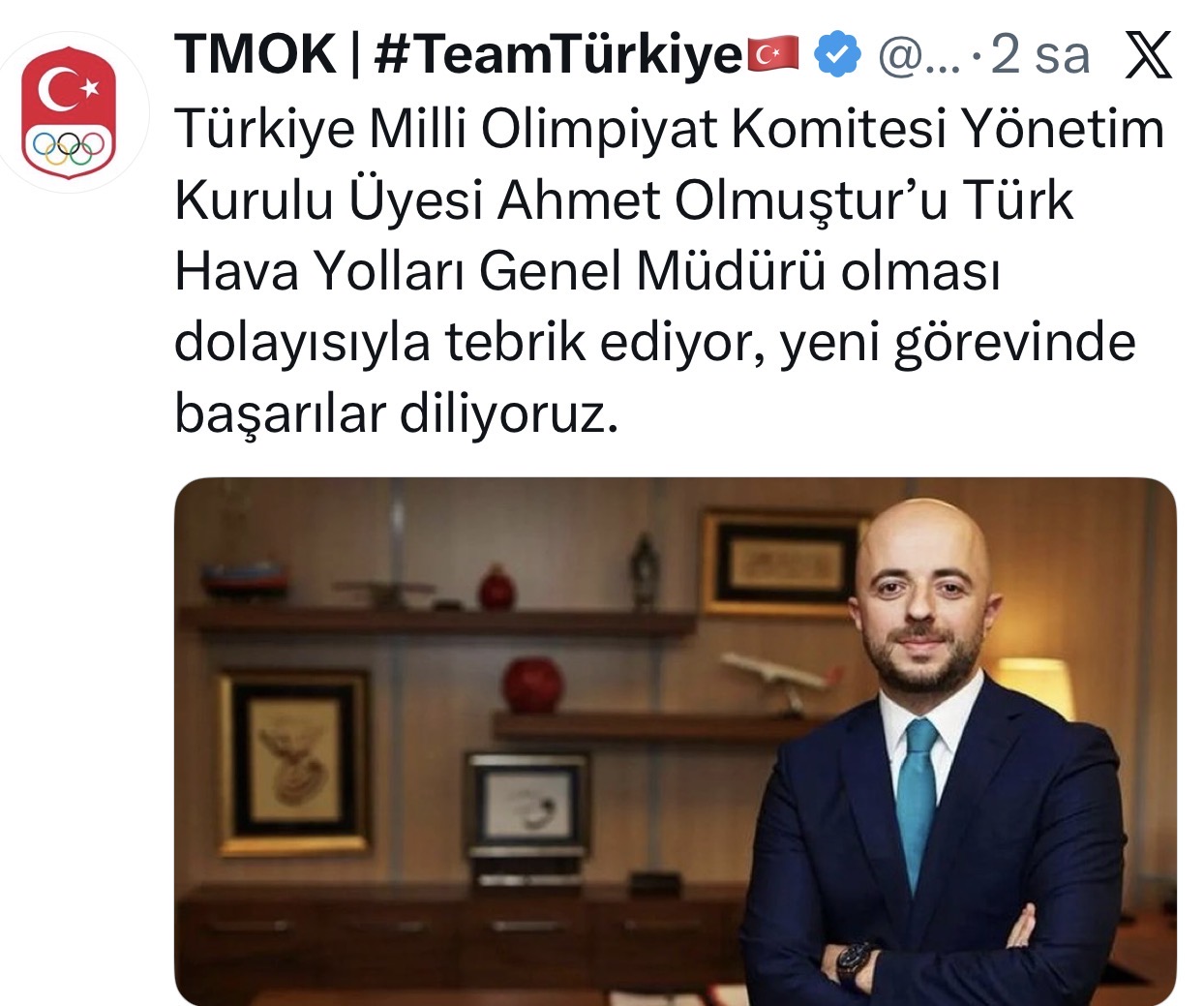 “Türkiye Milli Olimpiyat Komitesi Yönetim Kurulu Üyesi Ahmet Olmuştur’u Türk Hava Yolları Genel Müdürü olması dolayısıyla tebrik ediyor, yeni görevinde başarılar diliyoruz.” TMOK’un bu paylaşımı, Genel Kurul öncesi Olmuştur’un atamasının neredeyse kesinleştiği şeklinde yorumlandı.
