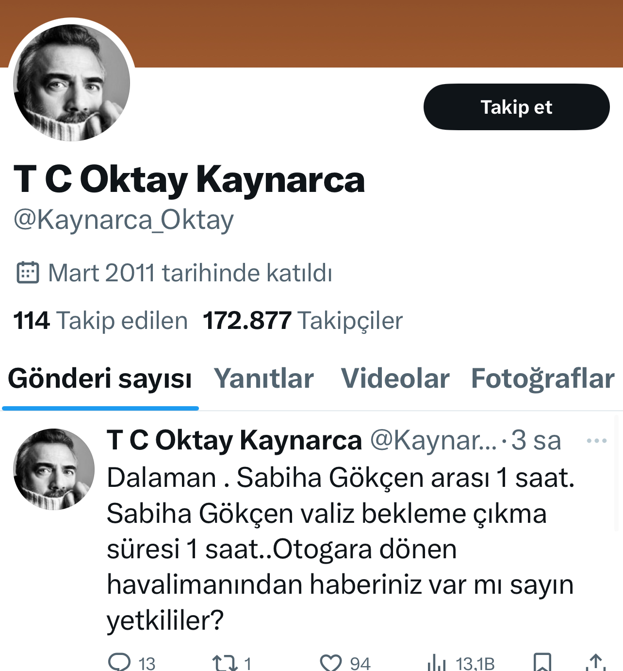 Ünlü oyuncu Oktay Kaynarca, sosyal medya hesabından, “Dalaman Sabiha Gökçen arası 1 saat. Sabiha Gökçen valiz bekleme çıkma süresi 1 saat. Otogara dönen havalimanından haberiniz var mı sayın yetkililer?” paylaşımında bulundu.