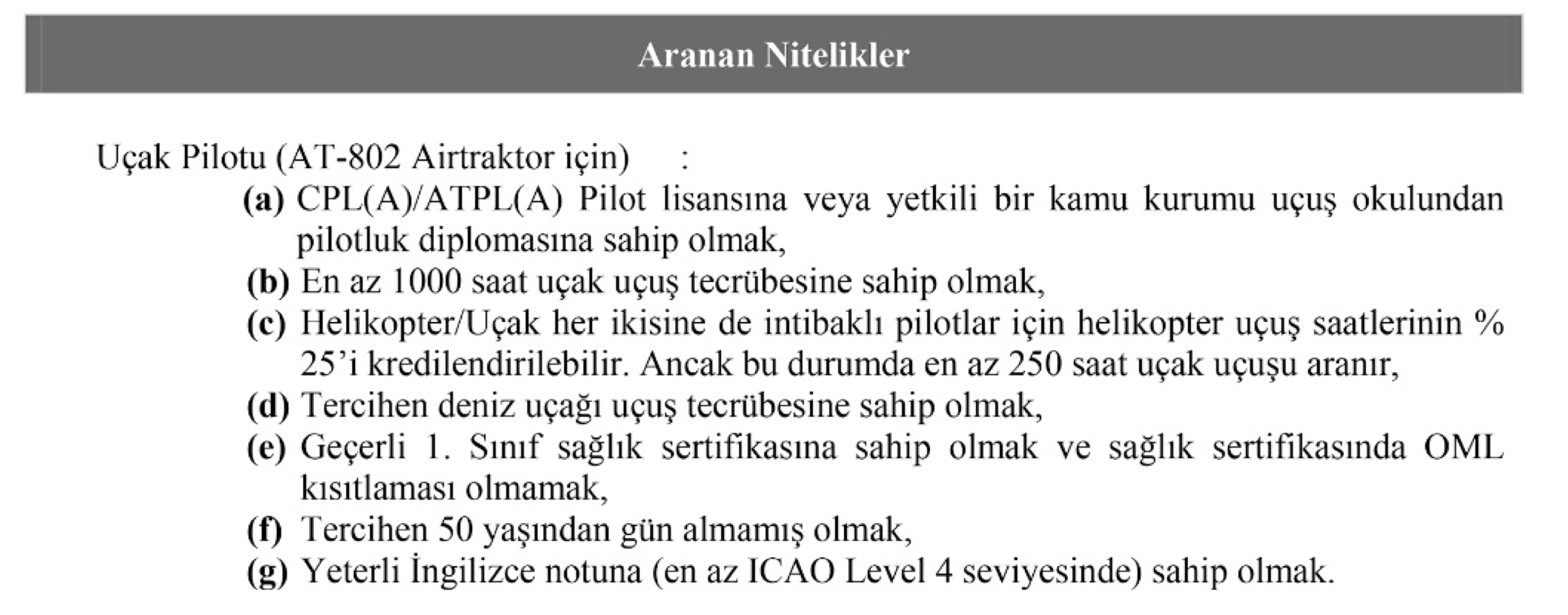 Tarım ve Orman Bakanlığı Orman Genel Müdürlüğü, yangın söndürme uçakları için KPSS puan şartı aranmaksızın 9 sözleşmeli pilot alımı için ilan yayınladı. Başvurusu kabul edilenler, 3 ton su taşıma kapasitesine sahip AT-802 Airtractor uçaklarında görev yapacak. Uçaklar hem suya inerek su ikmali yapabiliyorlar hem de karadan tanker vasıtasıyla su alabiliyor.